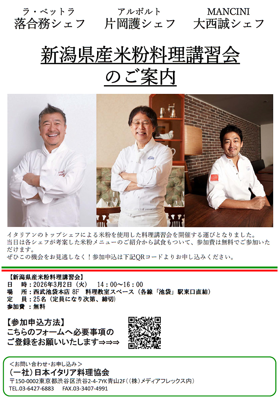 イタリアンのトップシェフによる米粉を使用した料理講習会を開催する運びとなりました。